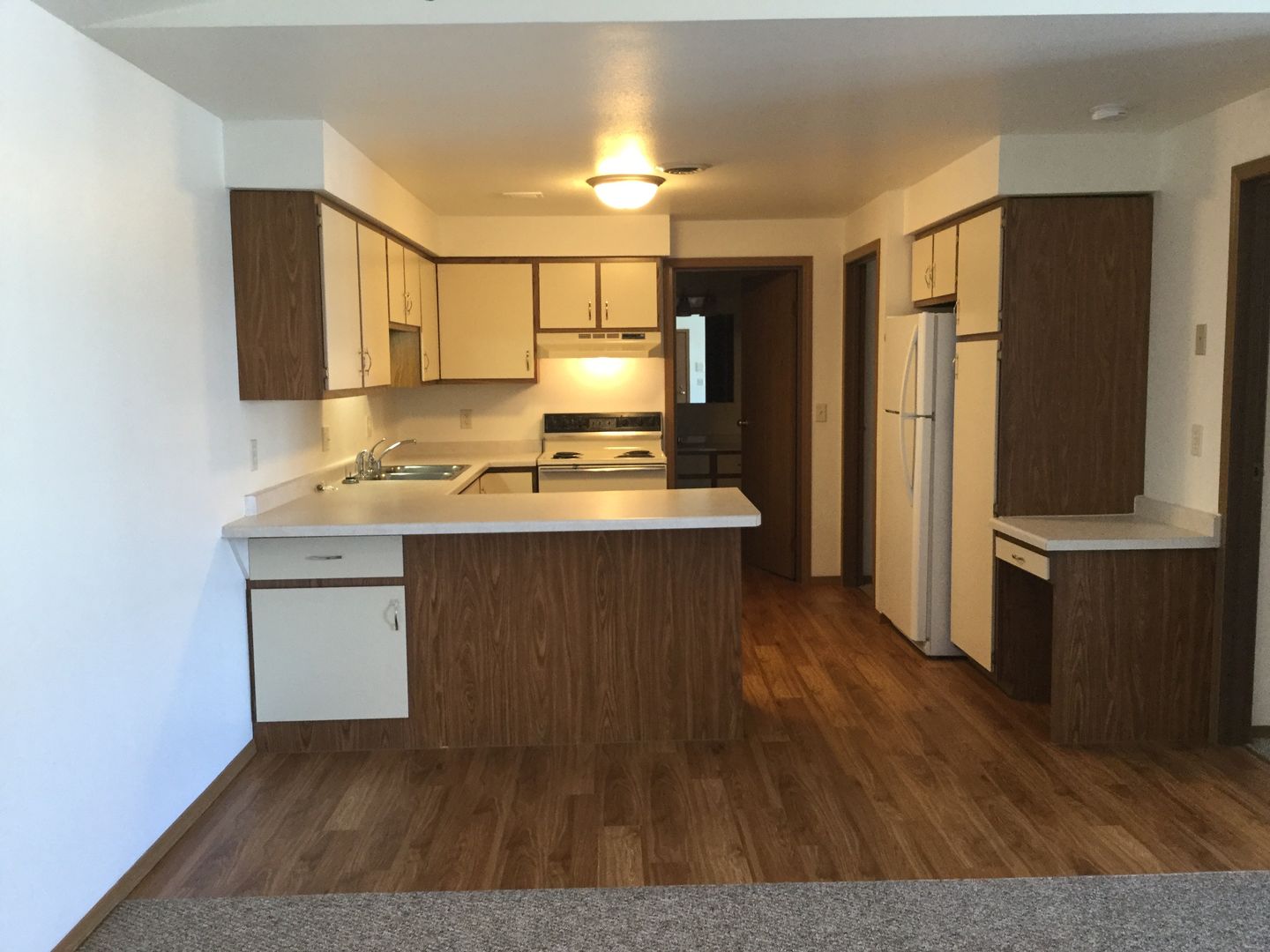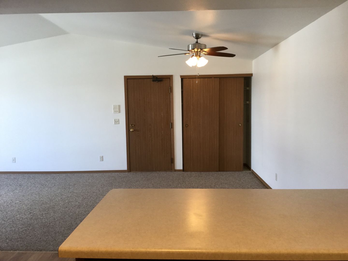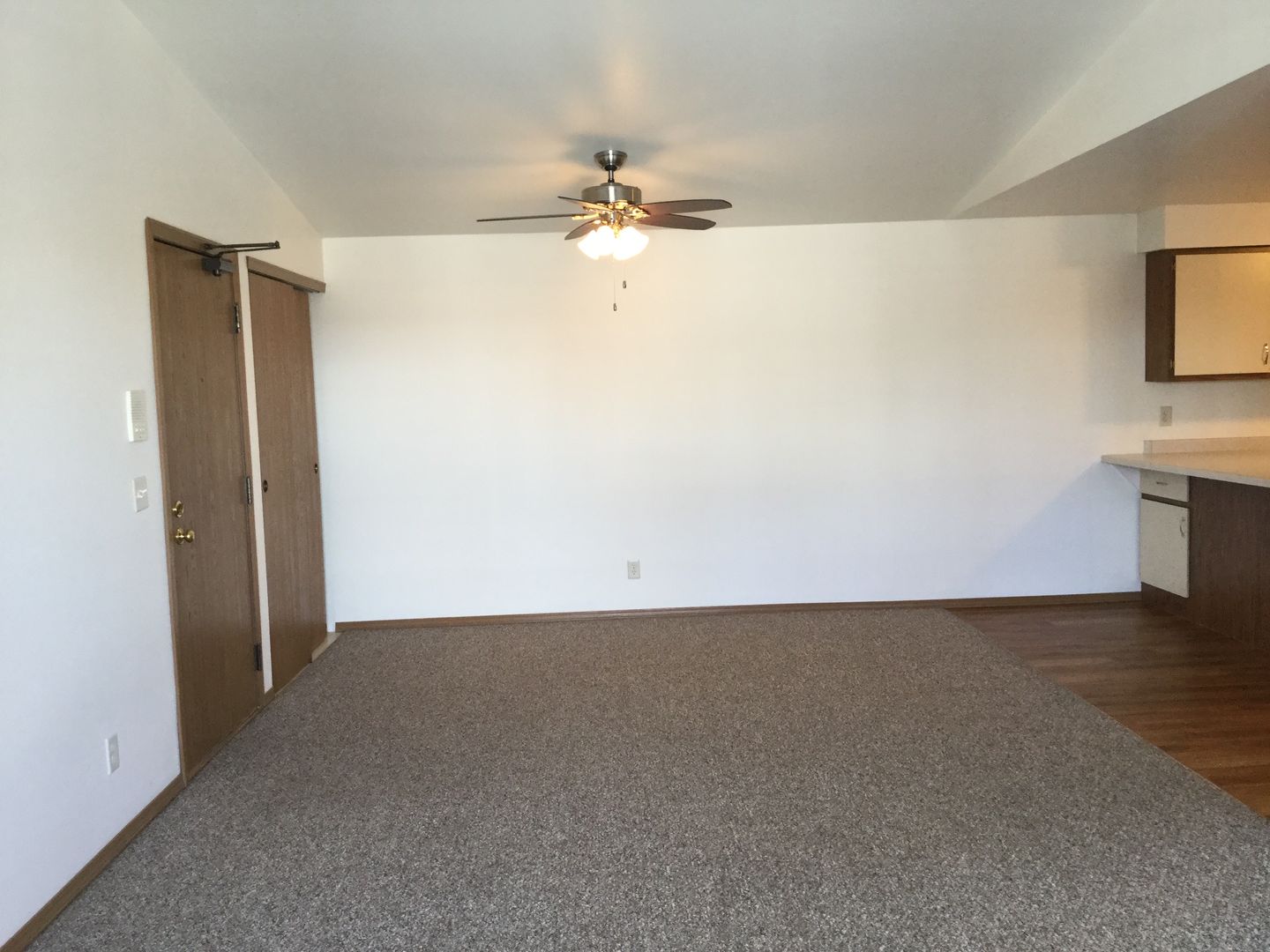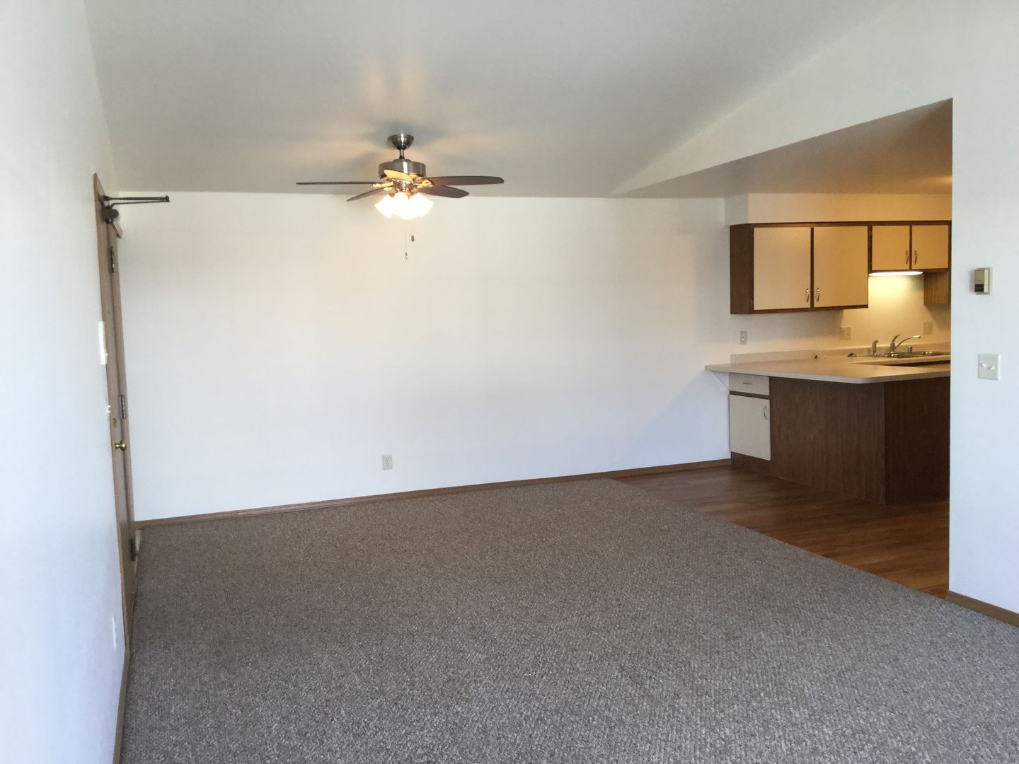 The apartment has a living/dining combination with vaulted ceiling, two bedrooms, one bath and garage.