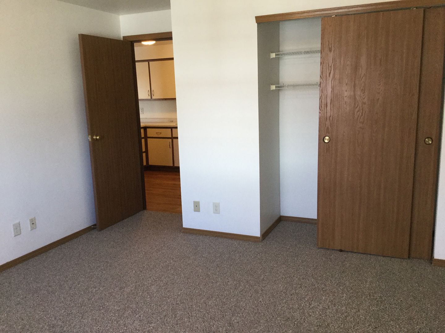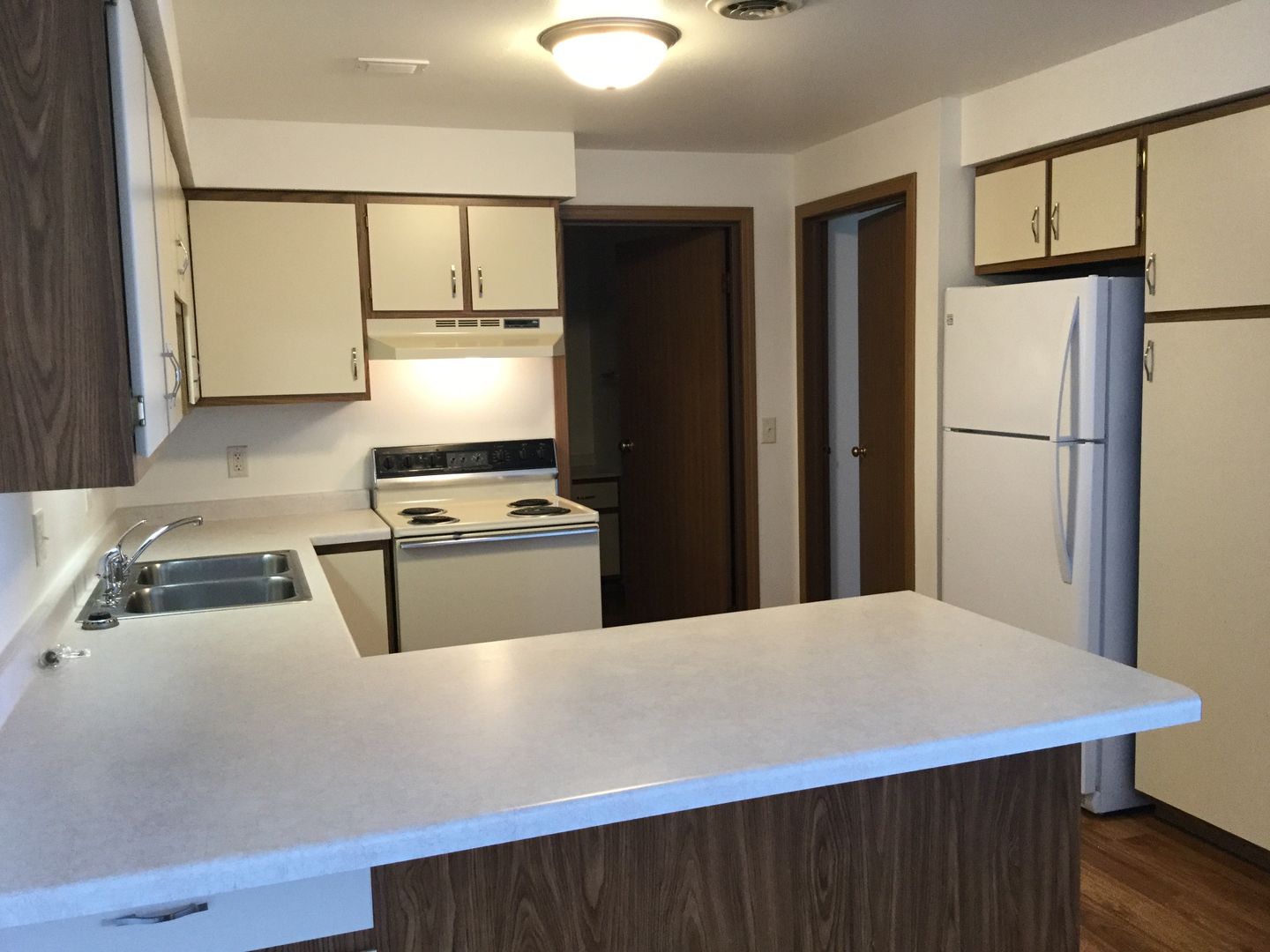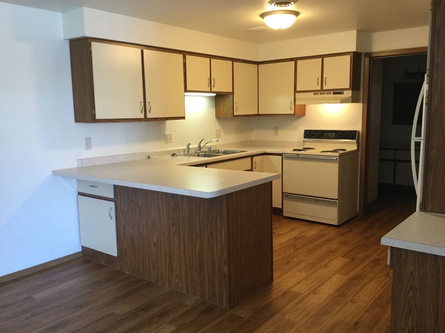 The apartment has a living/dining combination with vaulted ceiling, two bedrooms, one bath and garage.